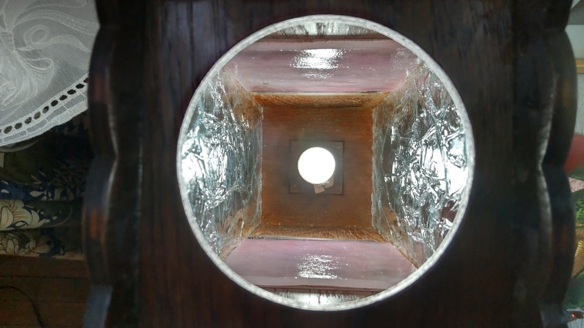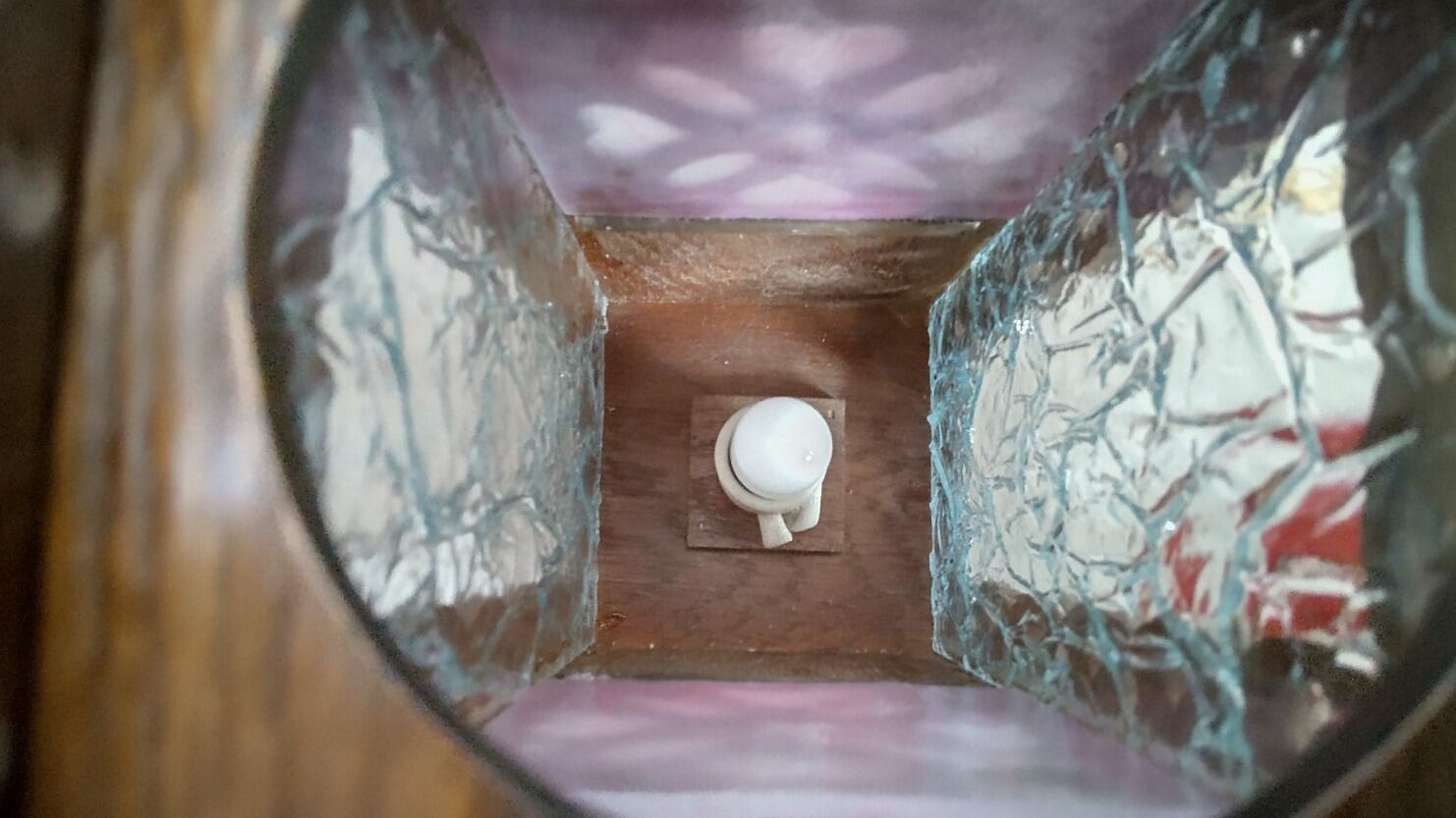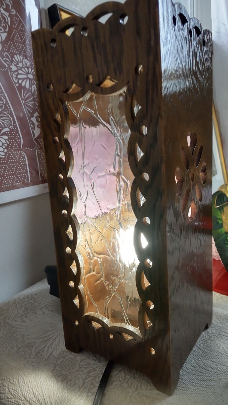 木製の照明器具にステンドグラス用のガラスを貼りました。